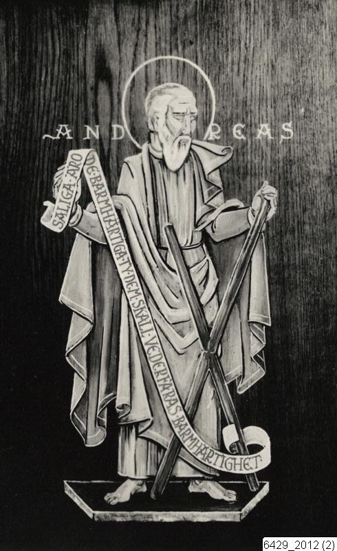 Bilden visar en målning av aposteln Andreas, på en bänkskärm i Mariakyrkan, målad av Hugo Gehlin.