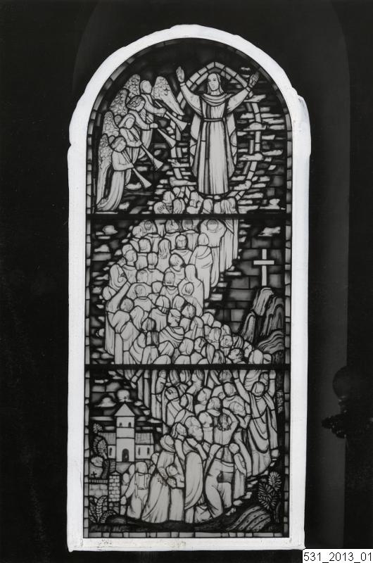 Bilden visar en glasmålning i Munka-Ljungby kyrka av Hugo Gehlin. Uppståndelsens dag, 1945.