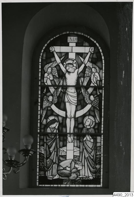 Bilden visar en glasmålning i Munka-Ljungby kyrka av Hugo Gehlin. Golgata, 1945.