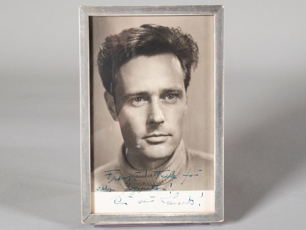 Fotografi föreställande skådespelare Lennart Lindberg. Porträttbild rakt framifrån, Lennart tittar åt höger, iklädd stickad polotröja skjorta. På bilden har han skrivit: Franzi! Tack för alla påprator (?) Din vän Lennart.
