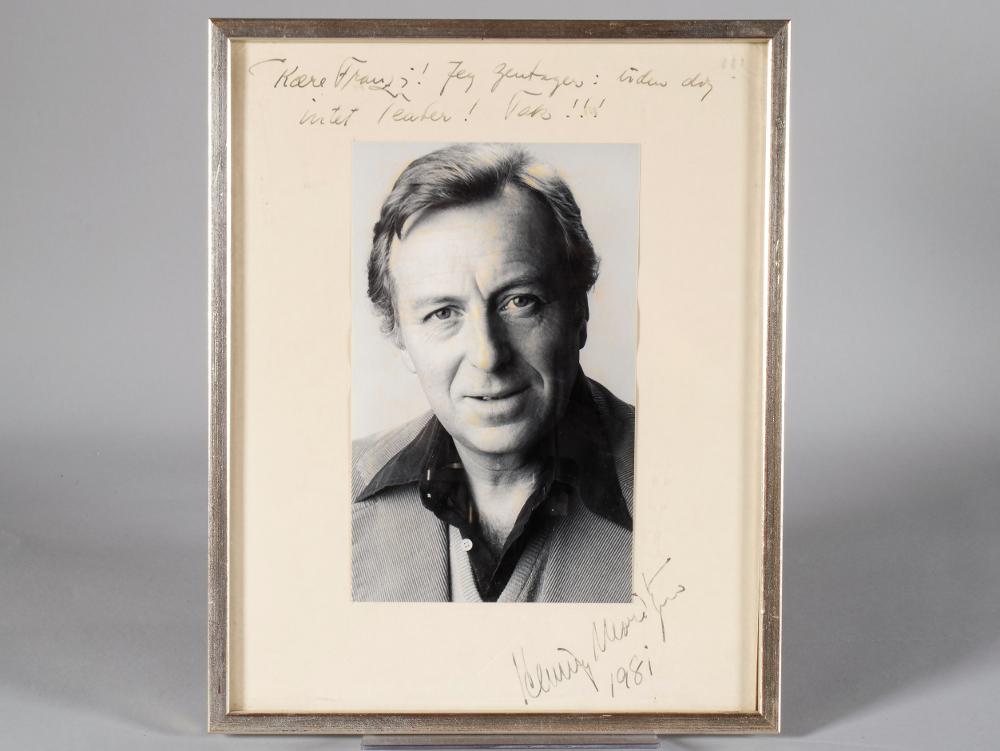 Fotografi föreställande den danske skådespelaren Henning Moritzen. Porträttbild rakt framifrån Henning är iklädd kavaj, tröja och skjorta. På bilden har han skrivit: Kaere Franzi! Jeg gentager: uden deg intet teater! Tak!!! Henning Moritzen 1981