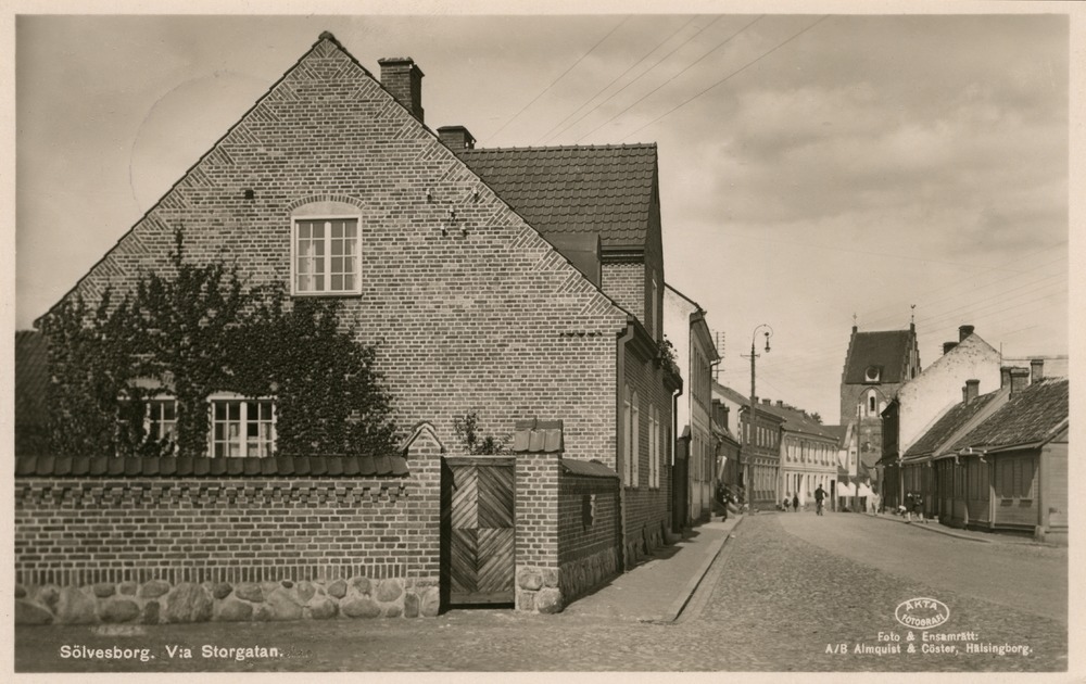 Svartvitt vykort föreställande V:a Storgatan i Sölvesborg.