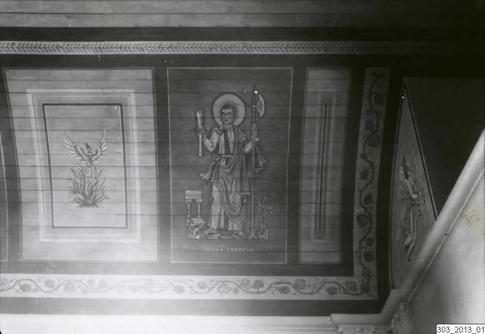 Målningarna föreställer aposteln Judas Taddeus, samt en fågel ovanför eldsflammor.