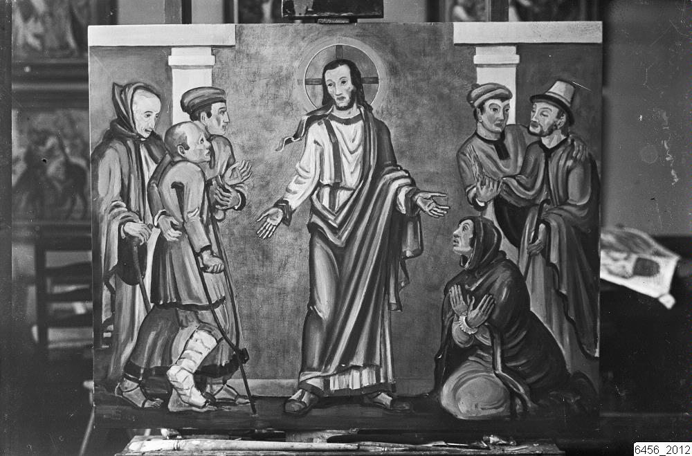 Bilden visar en målning av en biblisk scen där Jesus botar sjuka.
