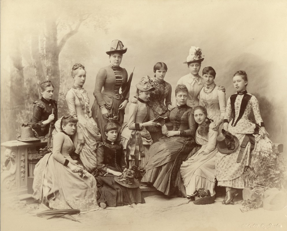 Grupporträtt av unga flickor och kvinnor. Flera av kvinnorna bär hatt och håller ihopfällda parasoll. Fotografiet är monterta på kartong.