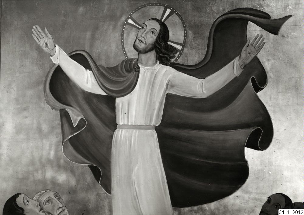 Bilden visar en detalj av altarskåpet i Södra Åsums kyrka, målad av Hugo Gehlin 1936. Motivet är Kristi himmelsfärd.