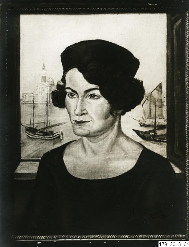 Bilden visar en stafflimålning, Venezianska 1924, av Hugo Gehlin. En kvinna framför ett fönster i Venedig.