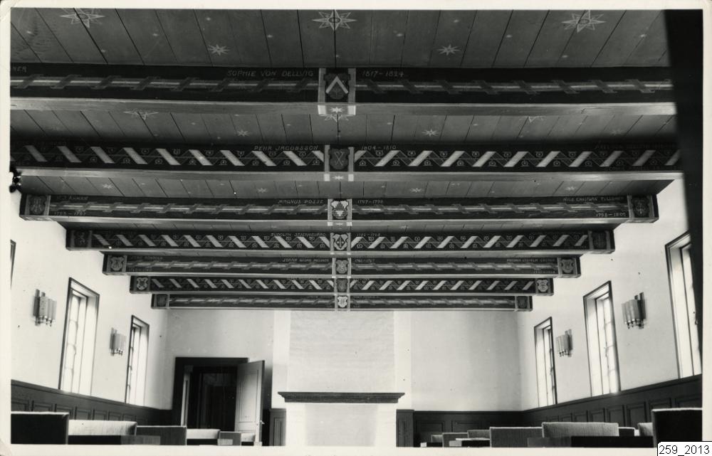 Bilden visar en interiör från Jacob Hansens hus med takdekoration på innertaket.