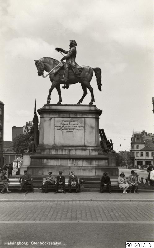 Bilden visar Stenbocksstatyn i Helsingborg. Framför statyn sitter människor på bänkar. I bakgrunden syns byggnader.