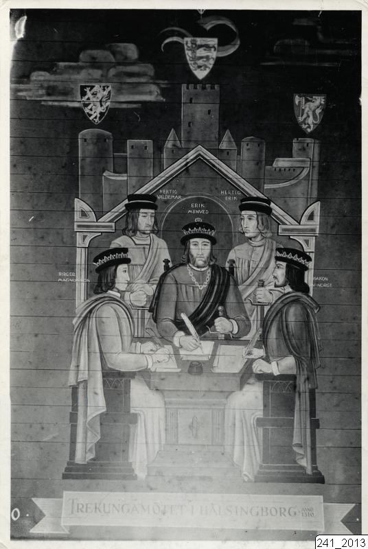 Målningen föreställer trekungamötet i Helsingborg år 1310.