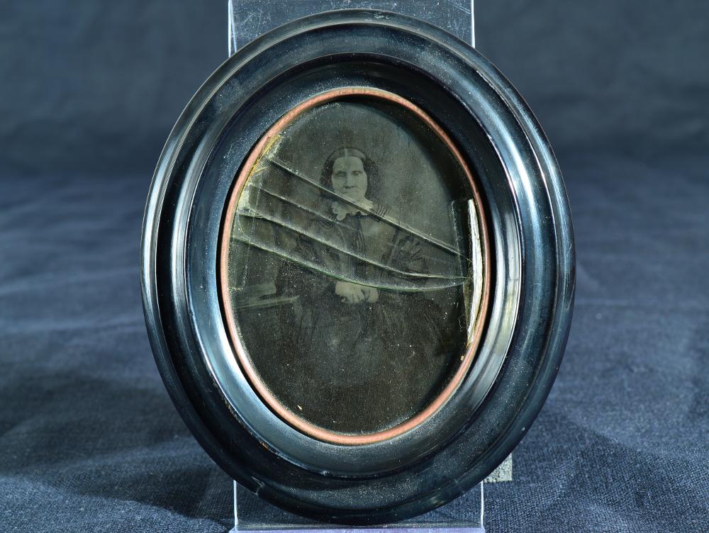 Svartvitt fotografi, ambrotyp, porträtt av en dam i svart sidenkappa, halvbild, enface. Glasad och ramad inom profilerad oval svartmålad träram. Bakstycke i svartmålat papper. Metallögla för upphängning. Tillhört Frk Petersson, Bruksgatan.