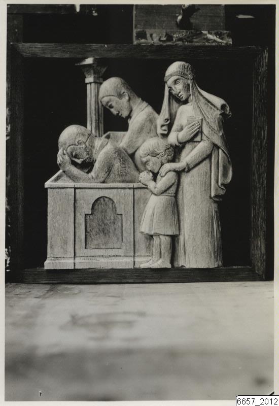 Bilden visar en genombruten relief som är utskuren i ek och förgylld utan kredering. Motivet är två män om sitter i en kyrkbänk och ber. Bredvid står en kvinna och ett barn som också ber.