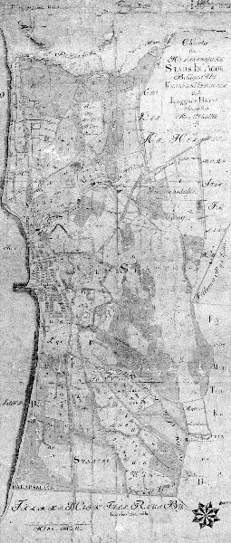 Svartvitt fotografi av en karta över Helsingborgs stads inägor och fäladsmark år 1787-1788.