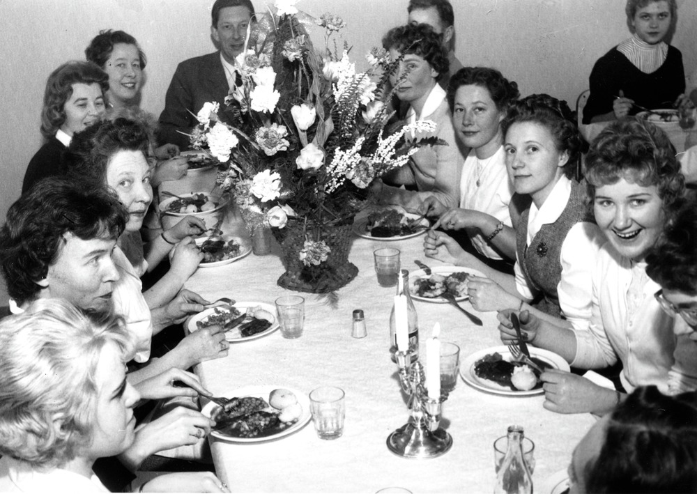 Personalfest på Margita konfektion. Runt ett bord sitter personalen och ät en måltid. På baksidan står namn på deltagarna samt notering att man beställt ex. till alla.