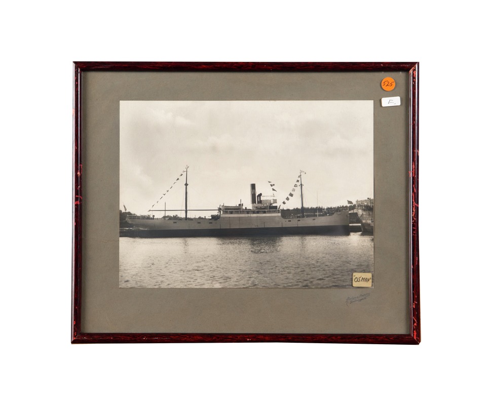Fotografi föreställande fartyget "Osman" liggande längs en kajkant med hissade signalflaggor. Bredvid "Osman" skymtar fören av ett annat fartyg. Fotografiet är monterat på papper som är stämplat av fotoatjlén Almberg & Preinitz och monterat i en brun träram. På baksidan finns två handskrivna noteringar om fartyget: