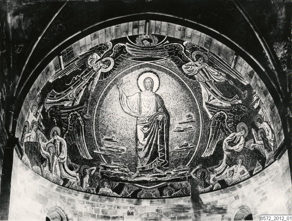 Bilden visar en interiör från Lunds domkyrka med Joakim Skovgaards mosaik Uppståndelsen i absiden i högkoret.