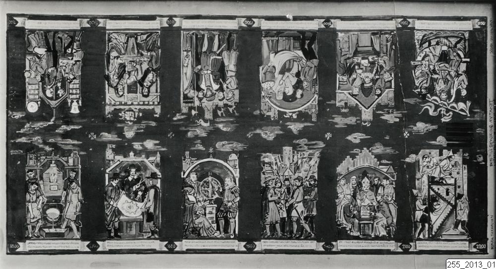 Beskrivning: Bilden visar en modell av takmålningar av Hugo Gehlin, till Jacob Hansens hus. Målningarna beskriver händelser i Helsingborgs historia och husets olika ägare.
