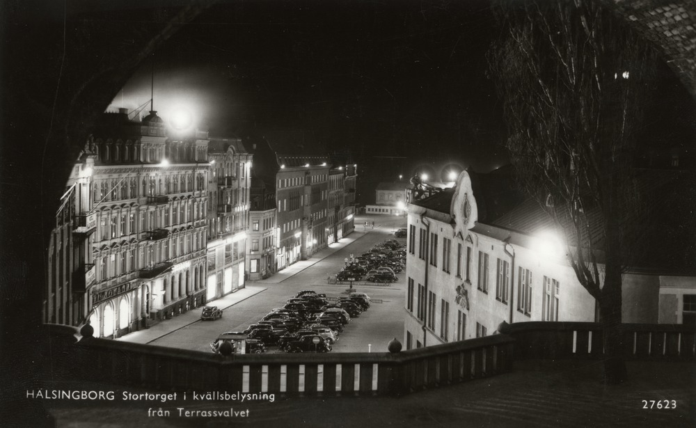 Svartvitt vykort föreställande Stortorget sett från terrasstrappan, Helsingborg.