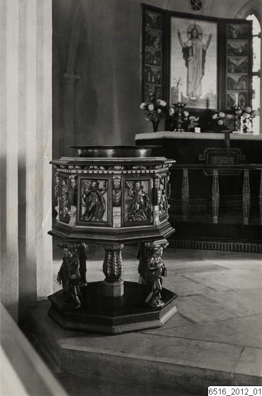 Bilden visar en interiör från Södra Sallerups kyrka. I förgrunden en dopfunt med bilder i relief på sidorna. Dessutom hålls den upp av bl a fyra små skulpturer. I bakgrunden altarskåpet och altaret med blomvaser och ljusstakar, samt altarring. Bakom altarskåpet skymtar ett fönster. Altarskåp och fönster av Hugo Gehlin.