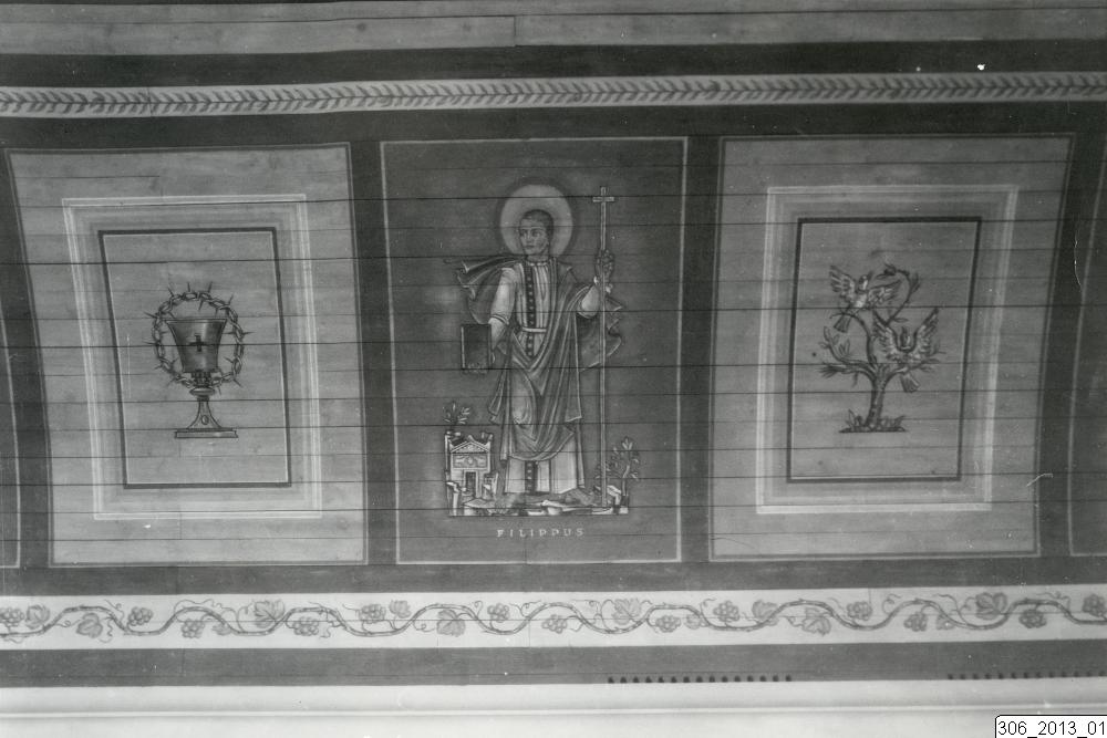 Beskrivning: Bilden visar en detalj av takmålningar i Allhelgonakyrkan i Helsingborg, av Hugo Gehlin. Målningarna föreställer aposteln Filippus, en kalk omgiven av en törnekrona samt ett träd med två fåglar.