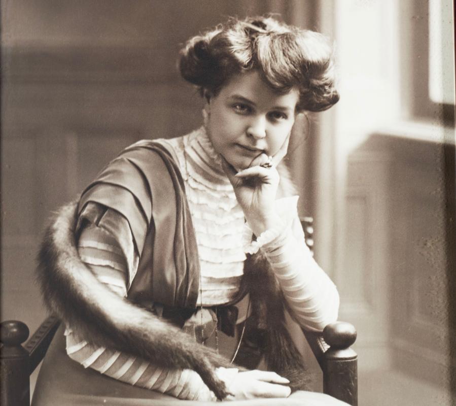 Svartvitt fotografi inom glas och ram föreställande en sittande kvinna som vilar huvudet i handen. Runt axlarna har hon en pälsstola.