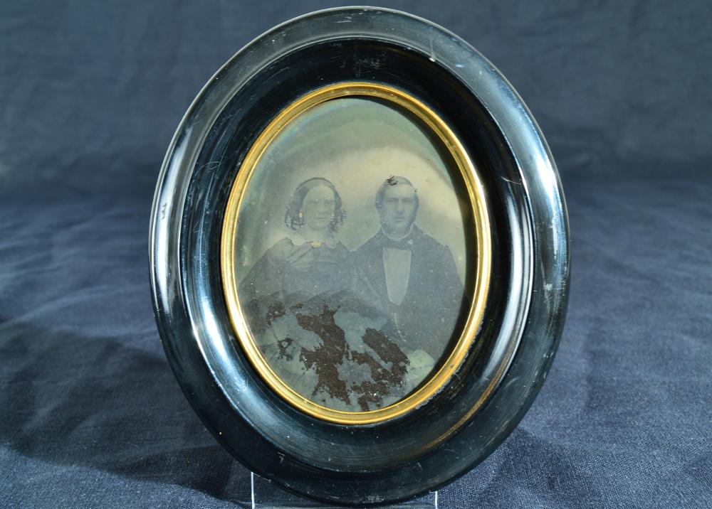 Svartvitt fotografi, ambrotyp, föreställande kett par sittande enface. Glasad och ramad inom oval profilerad svartmålad träram med metallkant i gulmetall inåt. Bakstycke i svart apapper och metall triangel för upphängning.