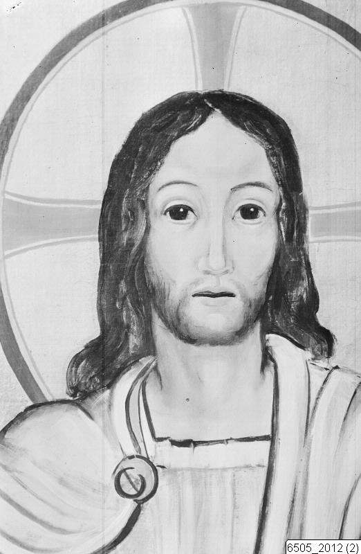 Bilden visar en detalj av altarskåpet i Södra Sallerups kyrka, målat av Hugo Gehlin. Motivet är Jesu huvud.