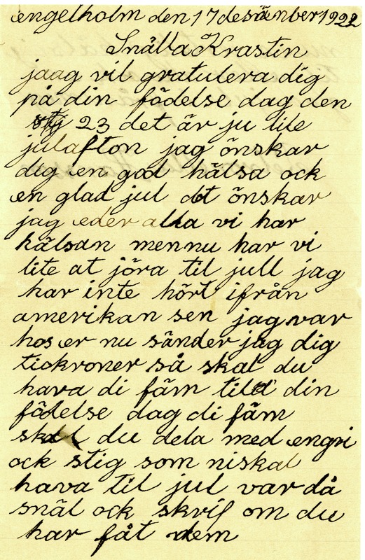 Brev skrivet av Petronella Hansson till Kerstin gift Lissing i december1922.