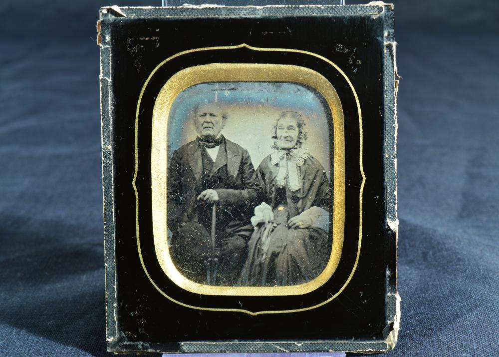 Svartvitt foto, ambrotyp, föreställande äldre par, sittande enface. Monterad med passepartout och svartmålat glas med linjedekor i guld. Ihopmonterad med svart papper längs kanterna. Svart papper som bakstycke och metallögla för upphägning.