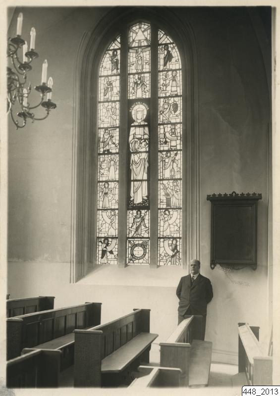 Bilden visar en glasmålning i S:t Petri kyrka i Malmö av Hugo Gehlin. Till höger under fönstret står Gehlin själv. I förgrunden kyrkbänkar. Uppe till vänster syns en ljuskrona.