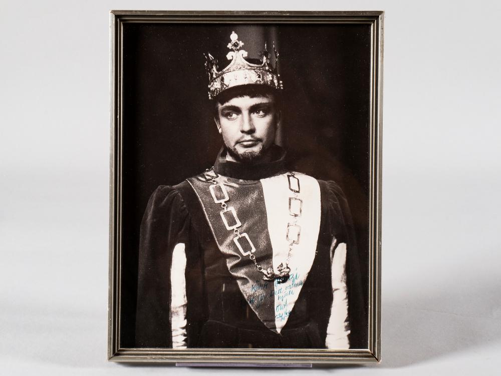 Fotografi föreställande skådespelare Per Olof Eriksson. Porträttbild från uppsättning 1958. Per Olof tittar åt vänster, iklädd mantel och krona. På bilden har han skrivit: Kära Franzi! Tack för ditt varma hjärta. Olof 22/11 - 58