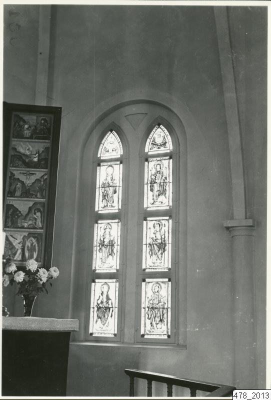 Glasmålningen föreställer 6 olika apostlar. På altarskåpet finns bibliska scener.