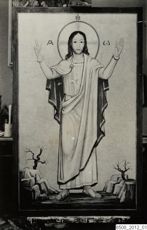 Bilden visar en del av altarskåpet i Södra Sallerups kyrka, målat av Hugo Gehlin. Motivet är målningen i mitten med Jesus i helfigur.