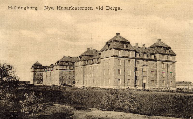 Svartvitt fotografi föreställande nya Husarkasernen vid Berga, Helsingborg.