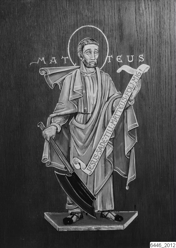 Bilden visar en målning av aposteln Matteus, på en bänkskärm i Mariakyrkan, målad av Hugo Gehlin.