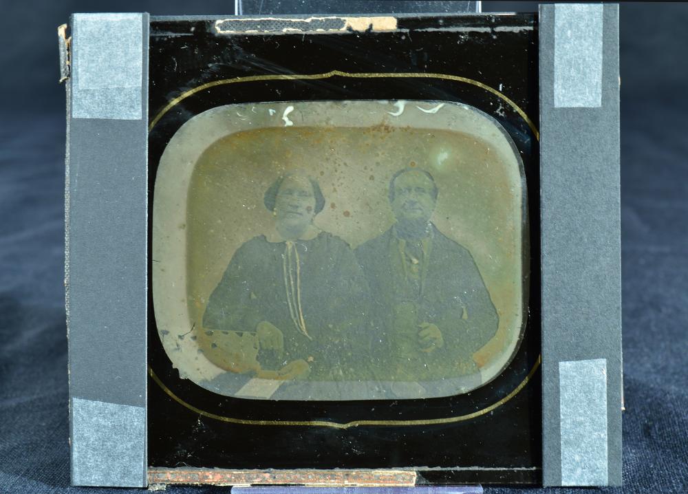 Svartvitt fotografi, ambrotyp, porträtt av sittande par i halvbild, enface, föreställande målare Lutman med fru, Helsingborg. Glasad, på glasaet svartmålad passepartout med guldlinjedekor. Svart papper längs kanten.