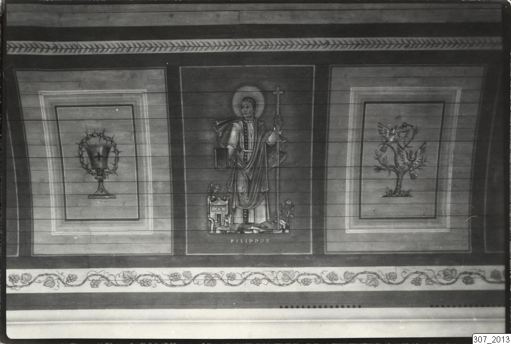 Målningarna föreställer aposteln Filippus, en kalk omgiven av en törnekrona samt ett träd med två fåglar.