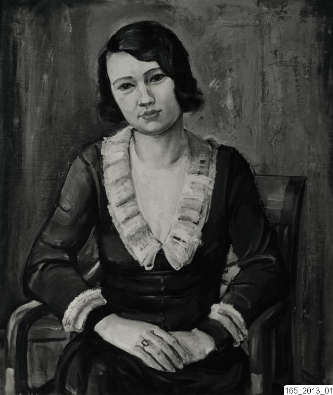 Beskrivning: Bilden visar en stafflimålning, Fru Eva 1930, av Hugo Gehlin. Sittande kvinna.