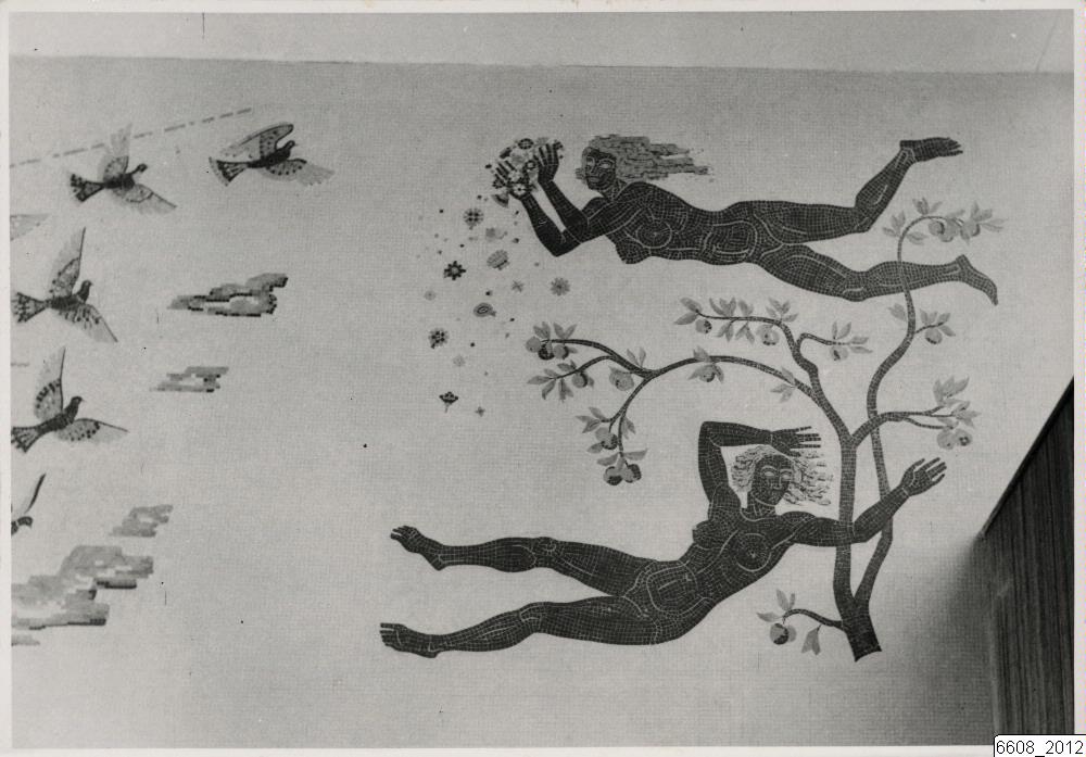 Bilden visar en detalj av mosaiken Aurora och Vindarna i Trelleborgs simhall, skapad av Hugo Gehlin 1942-43. I bildens nedre högra hörn syns en del av en träpanel på väggen.