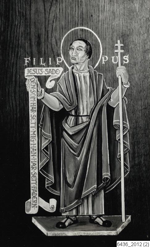 Bilden visar en målning av aposteln Filippus, på en bänkskärm i Mariakyrkan, målad av Hugo Gehlin.