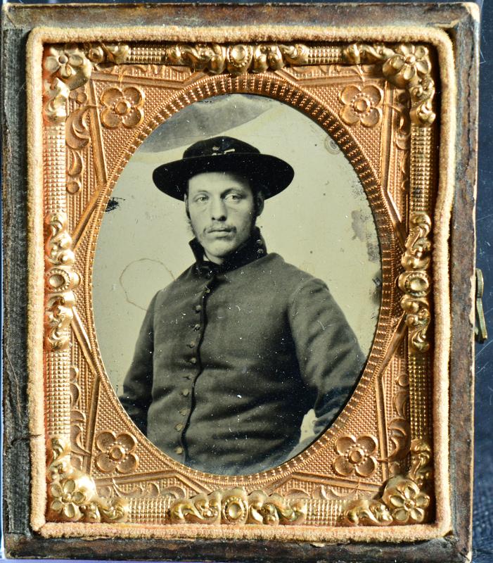 Svartvitt fotografi, utgörande högra halvan av hopfällbart etui, fotografiet föreställer uniformerad yngre man , inre ram av mässing med blömmor i vinklarna yttre ram av pressat läder. Metallhasp för stängning. ( samma foto som nr 626-67 )