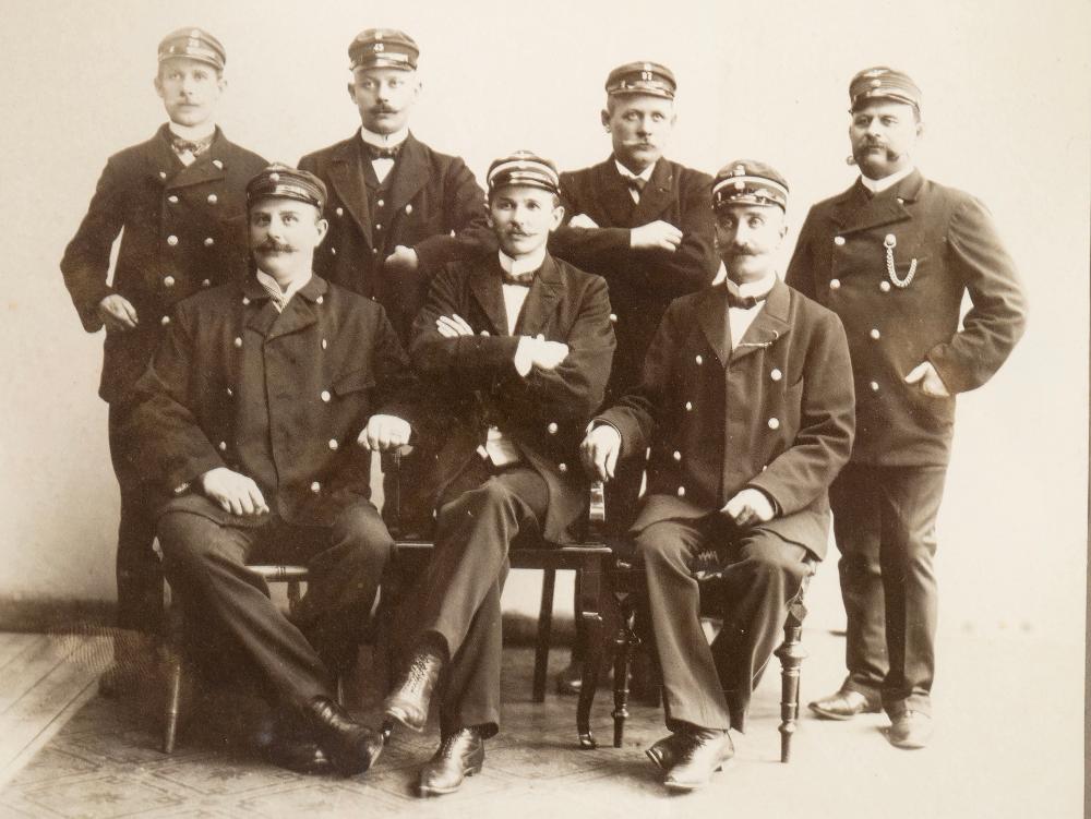 Svartvitt fotografi inom glas och ram föreställande Järnvägsmännens olycksfallsersättningsförenings centralstyrelse 1906.