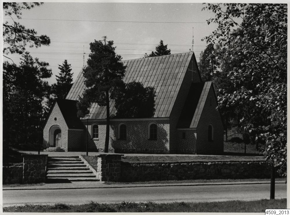 Bilden visar Hallstaviks kyrka omgiven av träd, trappa och mur. I förgrunden en väg.