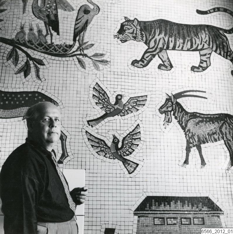 Bilden visar en del av en mosaik på Helsingborgs barnsjukhus, Djur i paradis, skapad av Hugo Gehlin. I bildens nedre hörn till vänster står Gehlin själv framför sin mosaik och tittar in i kameran.