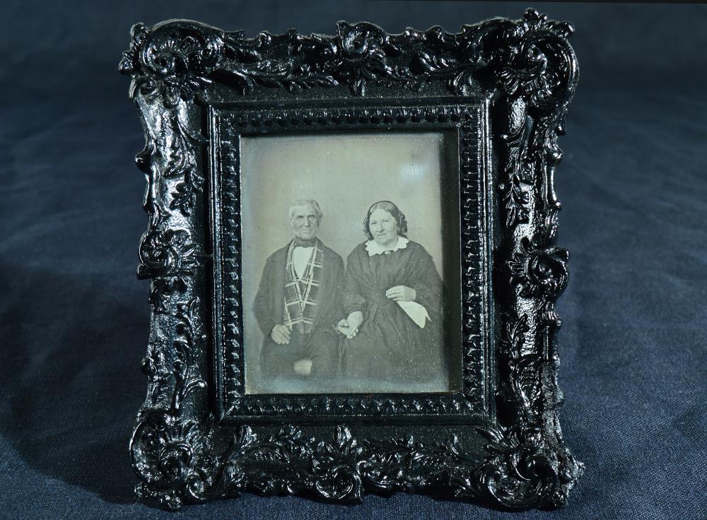 Svartvitt fotografi, ambrotyp, porträtt av sittande par som håller varandra i handen