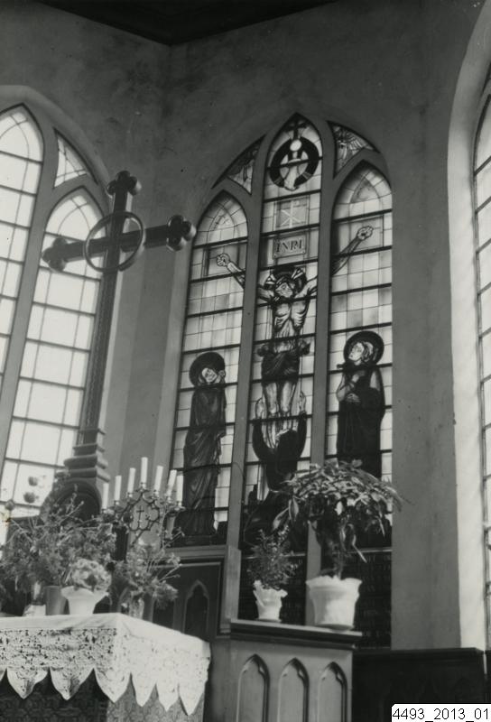 Bilden visar en glasmålning i Billinge kyrka av Hugo Gehlin. I förgrunden altaret med ett kors, ljusstake, krukväxter och blomvaser.