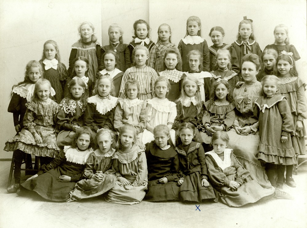 Svartvitt fotografi av en skolklass med flickor. Till höger sitter klassens lärarinna.