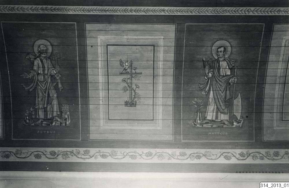 Målningarna föreställer apostlarna Petrus och Matteus, samt ett kors omgivet av blommor och en fågel.