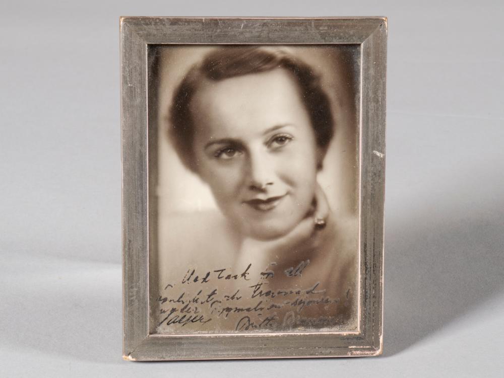 Fotografi föreställande skådespelare Britta Bruniusl. Porträttbild rakt framifrån. På bilden har hon skrivit: Med tack för all vänlighet och trevnad under Pygmalion sejouren! Britta Brunius