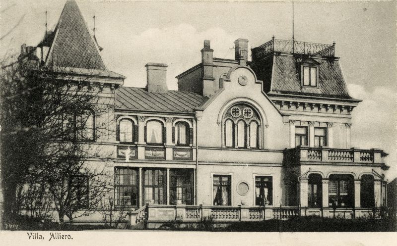 Villa Alliero, som låg på S:t Clemensgatan 1, Kv, Bröstvärnet i Helsingborg. Nederst på kortet står texten: "Villa, Alliero." Nu rivet. Nybyggnation skedde åren 1971-72.